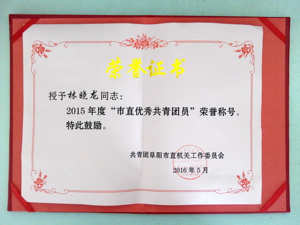 阜陽(yáng)市局鹽政隊(duì)員林曉龍被授予“市直優(yōu)秀共青團(tuán)員”榮譽(yù)稱號(hào)