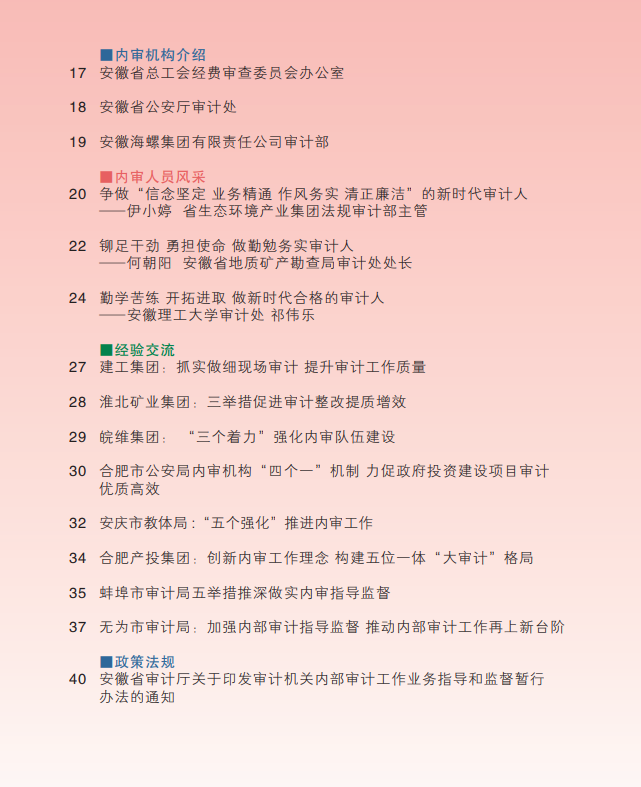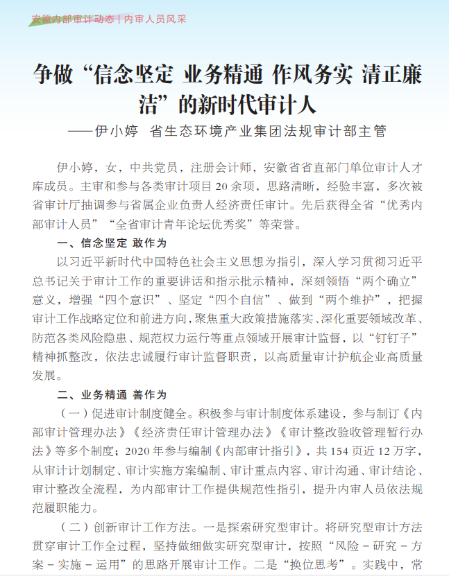 11月14日,集團(tuán)公司法規(guī)審計(jì)部主管伊小婷同志被省審計(jì)廳編印的《安徽內(nèi)部審計(jì)動(dòng)態(tài)》第3期——“內(nèi)審人員風(fēng)采”欄目宣傳報(bào)道。