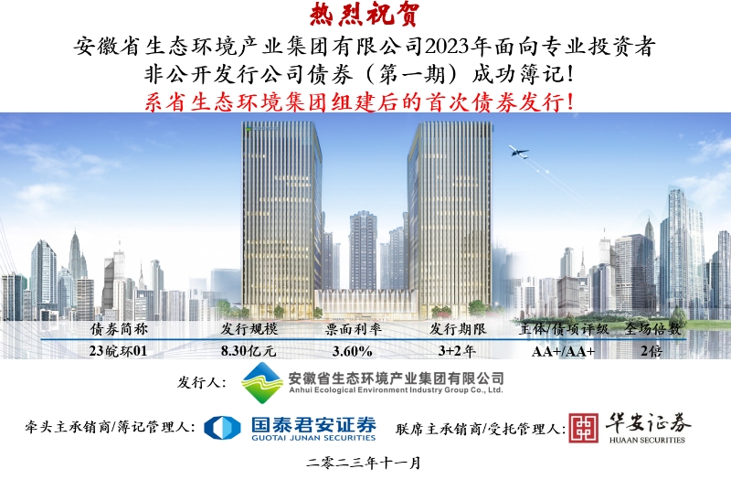 11月24日,省生態(tài)環(huán)境集團(tuán)首單非公開(kāi)公司債券(債券簡(jiǎn)稱(chēng):23皖環(huán)01,債券代碼:253104.SH)在上海證券交易所成功簿記發(fā)行,本次債券由國(guó)泰君安、華安證券主承銷(xiāo),募集金額8.3億元,期限3+2年,票面利率3.60%,圓滿完成集團(tuán)掛牌以后在資本市場(chǎng)的首次亮相。