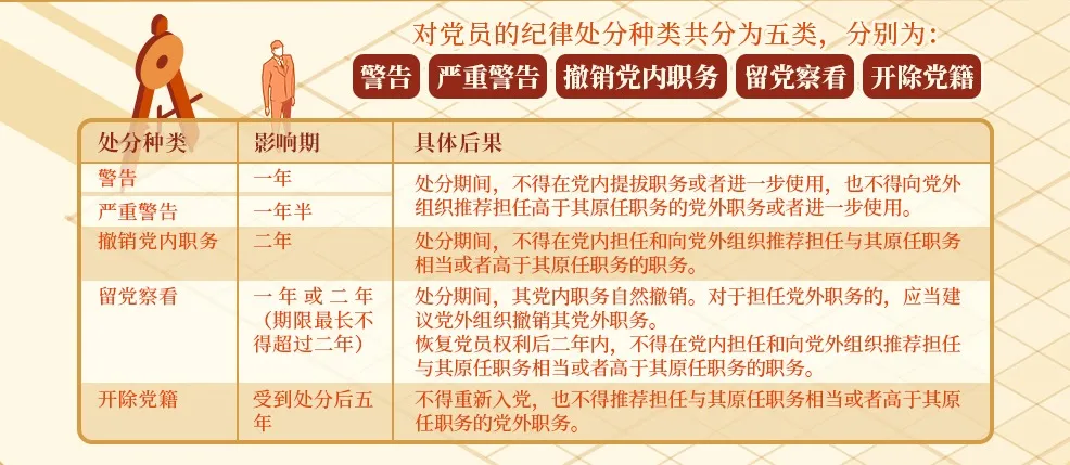 《中國共產(chǎn)黨紀(jì)律處分條例》規(guī)定,對黨員的紀(jì)律處分種類共分為五類,分別為警告、嚴(yán)重警告、撤銷黨內(nèi)職務(wù)、留黨察看和開除黨籍。