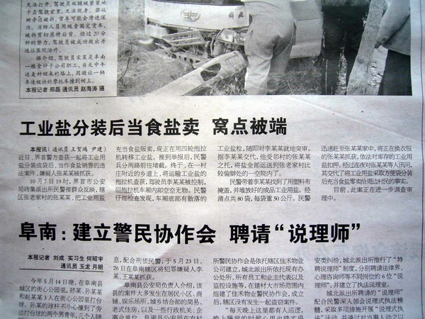 10月7日19時(shí),界首市公安局磚集派出所民警接群眾反映,轄區(qū)張老家村的張某某,把工業(yè)用鹽充當(dāng)食鹽販賣,現(xiàn)正在用四輪拖拉機(jī)轉(zhuǎn)移工業(yè)鹽。接到舉報(bào)后,民警兵分兩路前往堵截。終于,在一村莊附近的鄉(xiāng)道上,將運(yùn)輸工業(yè)鹽的拖拉機(jī)查獲,駕駛員李某某被控制,但拖拉機(jī)車廂內(nèi)卻空空無物。民警仔細(xì)檢查發(fā)現(xiàn),車廂底部有散落的工業(yè)鹽粒,隨即對李某某就地突審。據(jù)李某某交代,他受鄰村的張某某之托,將鹽全部運(yùn)送到張老家村比較偏僻處的一空院內(nèi)了。