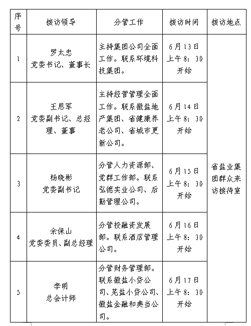 根據(jù)工作安排,現(xiàn)就省鹽業(yè)集團(tuán)領(lǐng)導(dǎo)班子成員6月份接待省鹽業(yè)系統(tǒng)職工群眾來訪安排公示如下: