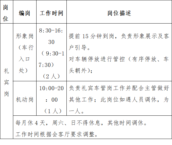 (3)客服崗:選派的客服人員必須經(jīng)過專業(yè)技能培訓(xùn),身體健康,品行良好,無違法違紀犯罪前科,具有初中以上文化程度,年齡在21至45周歲、身高1.65米以上。對現(xiàn)場的客戶接待服務(wù)工作有一定的意識。