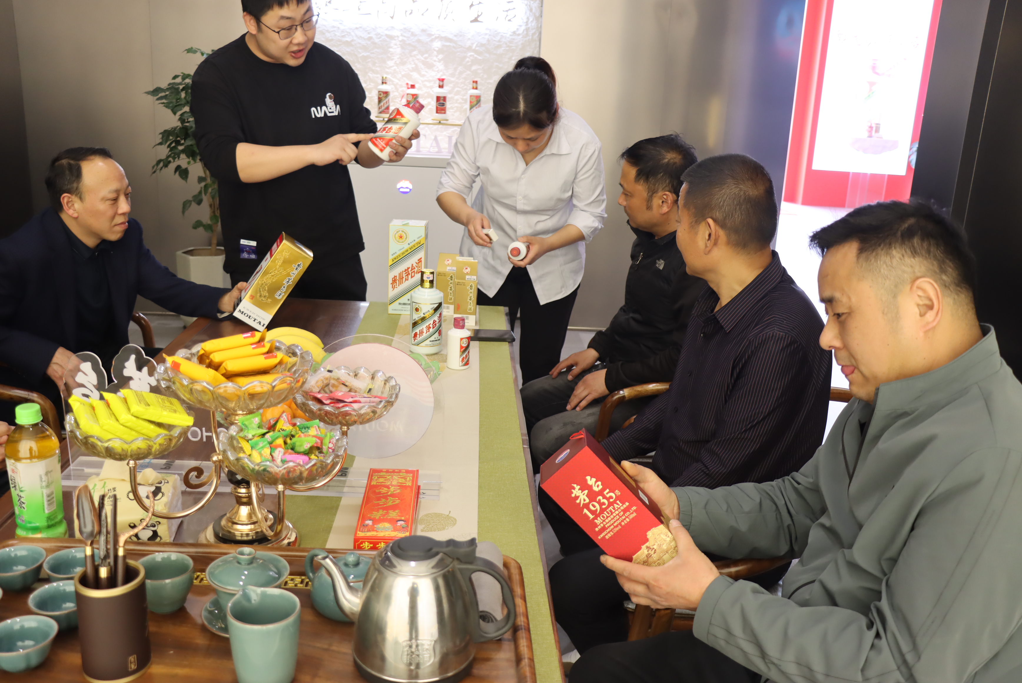 為客戶講解茅臺真?zhèn)舞b別方法,市面上出現(xiàn)不少整箱插花酒、真瓶針孔吊瓶酒、膠帽酒包裝制假售假的案例,面對先進的造假技術(shù),廣大消費者們要擦亮眼睛,可以通過包裝、瓶身、防偽標識等辨別真假,真茅臺的包裝彩盒質(zhì)地較硬,印刷精美,顏色均勻,部分文字及圖案有明顯的凹凸感,通過專用識別器觀察瓶蓋,真酒的帽套頂部呈亮黃色,上有黑色浮點,而且可以隨帽套的轉(zhuǎn)動在亮黃色背景范圍內(nèi)漂移。在購買茅臺產(chǎn)品時要通過i茅臺APP、專賣店、自營店等正規(guī)渠道購買茅臺酒,并保存發(fā)票,以便日后有據(jù)可查,憑發(fā)票舉報、索賠。