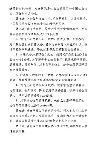 對違反公約第四條 1 款的(守法合規(guī)),依法處理,依規(guī)執(zhí)行,對不履行鹽行業(yè)自律義務(wù),有損行業(yè)和他人利益的行為,視情節(jié)輕重采取通報、降低信用等級直至取消會員資格。