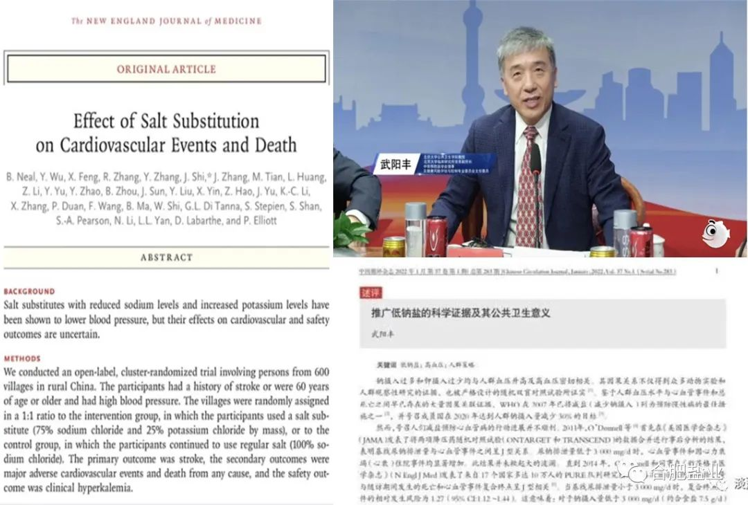 2014年,北京大學等多所中外大學開展了一項低鈉鹽研究,在中國北方600個村莊,挑選了2萬多名60歲以上,有高血壓、腦卒中基礎(chǔ)病的老人做志愿者,把他們分成兩組,一組免費供應(yīng)食用低鈉鹽,一組免費供應(yīng)食用普通食鹽,項目持續(xù)跟蹤了5年,5年里有4000多名老人因病去世,因為他們本就有比較重的基礎(chǔ)病,經(jīng)過對比,食用低鈉鹽這組老人腦卒中率下降14%、全因死亡率下降12%,因此推廣低鈉鹽被寫入健康中國行動,北京大學的武陽豐教授有個觀點,就是全國普通食鹽都換成低鈉鹽,每年能減少100萬人過早死亡。低鈉鹽研究的論文被發(fā)表在世界四大醫(yī)學期刊-新英格蘭醫(yī)學雜志(NEJM)上。