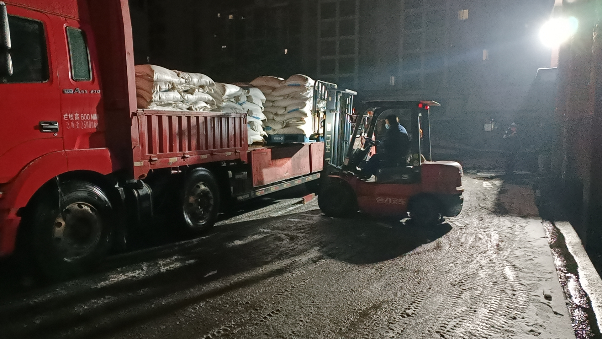 公司領(lǐng)導(dǎo)班子親赴倉儲配送一線指揮調(diào)度,全市一市五縣鹽業(yè)干部職工眾志成城抗冰雪,頂著風(fēng)雪嚴(yán)寒,冒著雨雪和刺骨的寒風(fēng)奮戰(zhàn)在保供一線。截至2月4日下午,合肥鹽業(yè)共出動配送車輛200臺次、配送人員100余人次、累計發(fā)出融雪鹽1500余噸,為清除全市各大公共交通道路積雪提供了有力保障。同時,將倉庫內(nèi)過期及破損小包裝鹽品拆袋裝換,為此次保供任務(wù)轉(zhuǎn)化融雪鹽品近20噸。4日晚上11點(diǎn)臨時接到市政部門緊急用鹽,公司搬運(yùn)人員在已連續(xù)作戰(zhàn)48小時的情況下,仍第一時間從家中趕至公司,奮戰(zhàn)在融雪鹽保供一線。