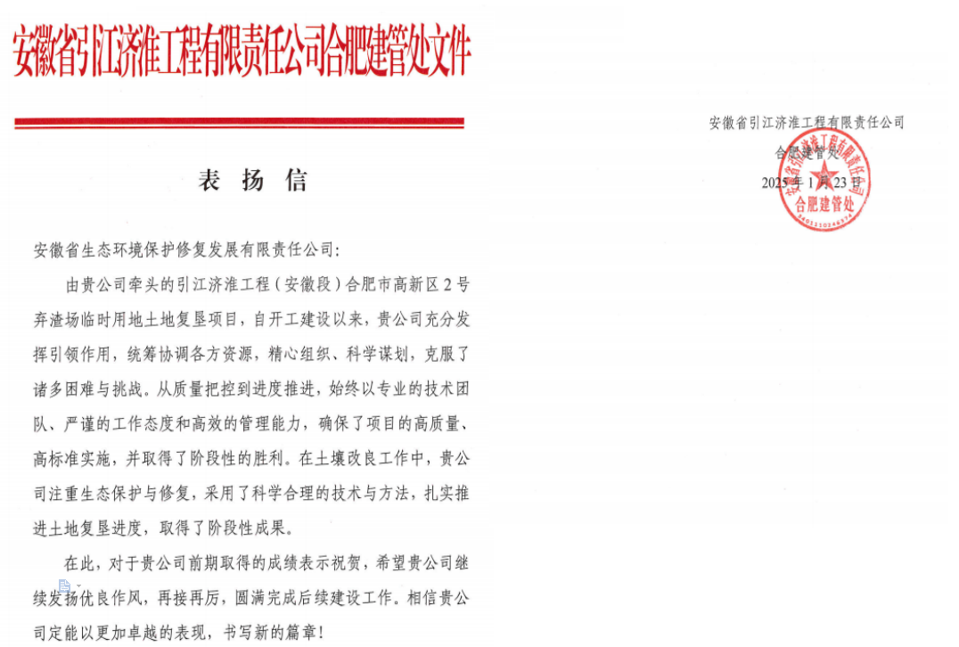 新年的第一封表?yè)P(yáng)信帶著溫暖而至,1月23日,安徽省引江濟(jì)淮工程有限責(zé)任公司合肥建管處致表?yè)P(yáng)信,信中對(duì)生態(tài)修復(fù)公司牽頭的引江濟(jì)淮工程(安徽段)合肥市高新區(qū)2號(hào)棄渣場(chǎng)臨時(shí)用地土地復(fù)墾項(xiàng)目的建設(shè)質(zhì)量、進(jìn)度推進(jìn)以及土壤改良等方面的工作給予充分肯定,對(duì)項(xiàng)目部同事的專(zhuān)業(yè)素養(yǎng)和工作作風(fēng)給予高度贊揚(yáng)。