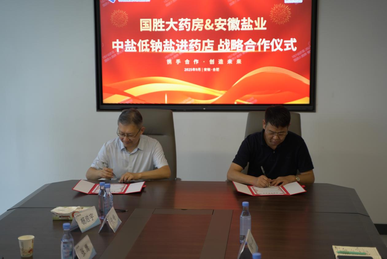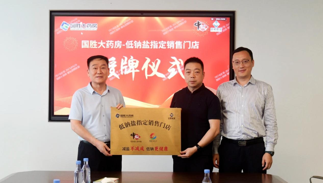 儀式現(xiàn)場,雙方圍繞“高鹽飲食危害防控”與“低鈉鹽全民推廣路徑”展開深入研討,達(dá)成了“政策同向、使命同頻”的戰(zhàn)略共識,共同致力于將健康干預(yù)覆蓋至家庭單元。隨后,安徽省鹽業(yè)集團(tuán)與國勝大藥房簽署了戰(zhàn)略合作協(xié)議,安徽省鹽業(yè)集團(tuán)與中鹽東興公司共同向國勝大藥房授予“中鹽低鈉鹽指定銷售門店”牌匾,宣告低鈉鹽的健康推廣與銷售在醫(yī)藥渠道正式啟動。