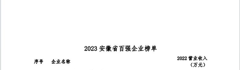 2023年11月22日,安徽省企業(yè)聯(lián)合會(huì)、安徽省企業(yè)家聯(lián)合會(huì)舉辦了2023安徽百?gòu)?qiáng)企業(yè)發(fā)布會(huì)暨企業(yè)家論壇,現(xiàn)場(chǎng)發(fā)布了“2023安徽省百?gòu)?qiáng)企業(yè)”榜單,及“2023安徽省制造業(yè)百?gòu)?qiáng)企業(yè) ”“2023安徽省服務(wù)業(yè)百?gòu)?qiáng)企業(yè)”榜單。該活動(dòng)迄今已經(jīng)連續(xù)開展十九屆,基本囊括了安徽營(yíng)收規(guī)模排在前列的各類企業(yè)。