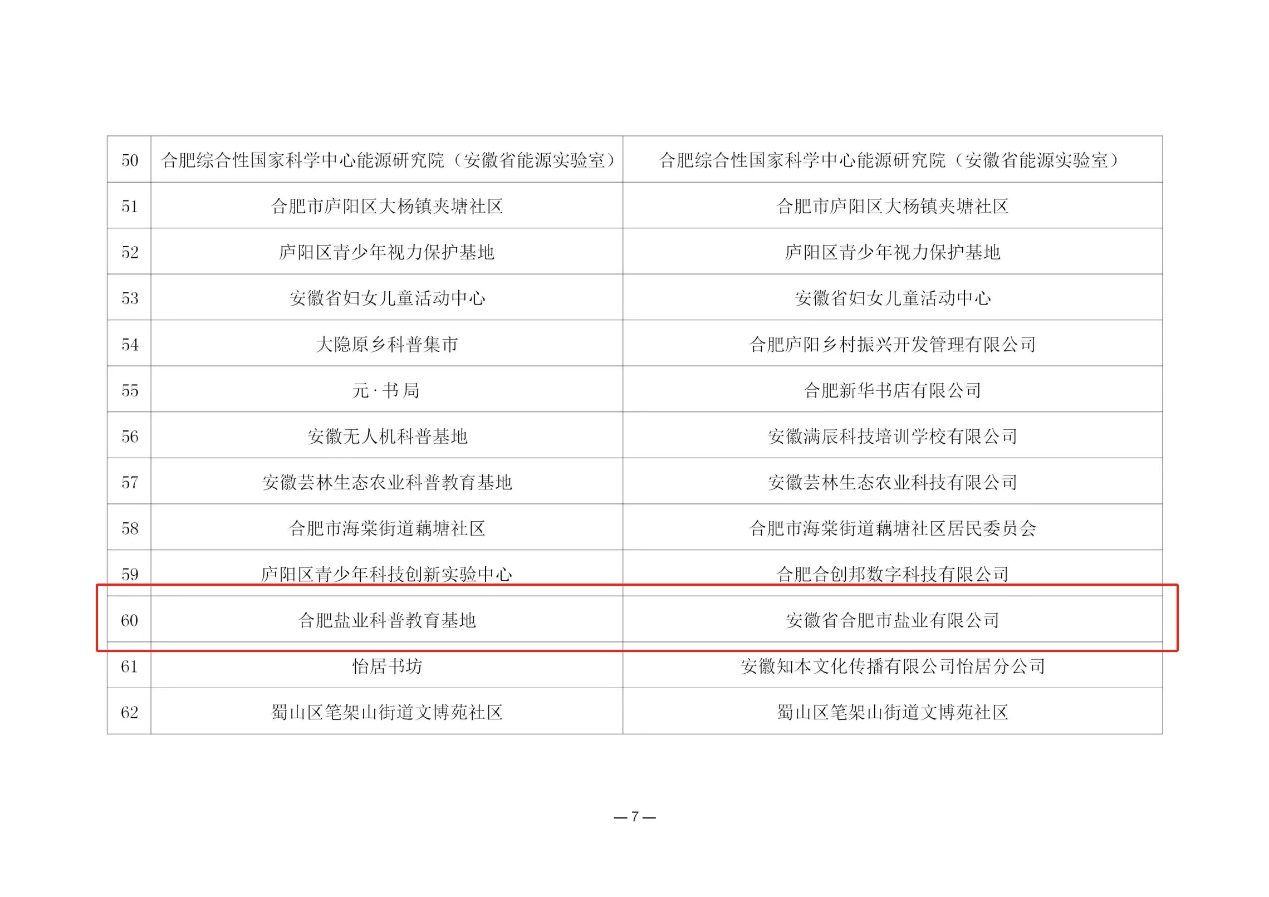 9月21日,合肥市科學(xué)技術(shù)協(xié)會(huì)經(jīng)各地各單位申報(bào)推薦、評(píng)審、驗(yàn)收、公示等程序,正式發(fā)文公布命名合肥鹽業(yè)等126家場(chǎng)館為“2023-2026年度合肥市科普教育基地”。